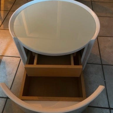 Lille hvidt bord med stel i metal og træ knop
