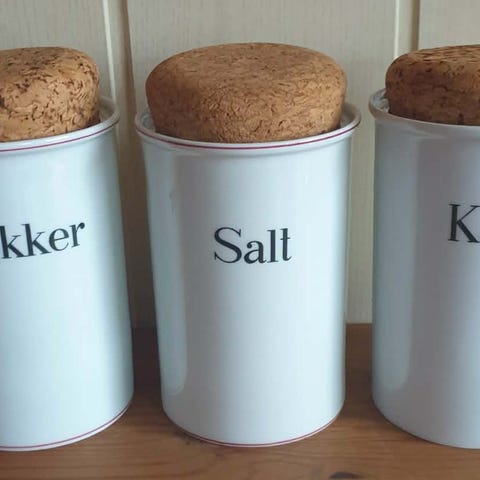 Sort Studio Salt og Peber sæt i hvid porcelæn. Sættet består af to beholdere med tekst 'Salt' og 'Peber' på dansk. Designet med huller i top. Velegnet til brug ved spisebordet .