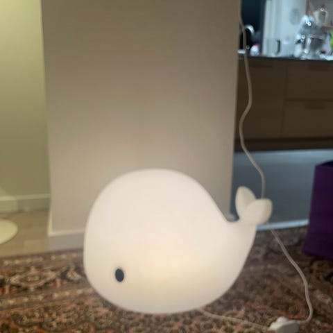 Filibabba gulvlampe i hvid plast. Lampen er formet som en hval med sorte øjne og har en mat finish. Velegnet til belysning til børneværelse til om natten.