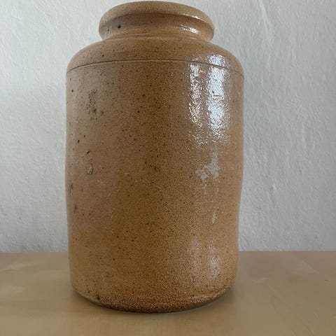 Stentøj krukke med to håndtag og blåt blomsterdekoration på ydersiden. Krukken har en naturlig beige farve og en glaseret inderside. Velegnet til opbevaring eller dekoration.