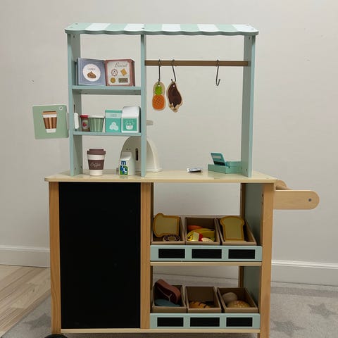 Købmandmandsdisk med flere tilbehør, inkluderet kasseapparat, køkkenredskaber, legemad og opbevaring. Produktet er lavet af træ og plastmaterialer, designet for leg og læring.