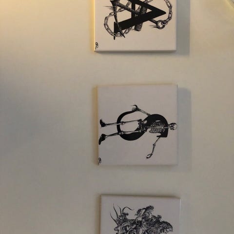 4 Kakler i træramme, fremstillet i forbindelse med ECCO´s 25 ås jubilæum. Motivet viser forskellige illustrationer med årstal som fortæller ECCO´s historie fra 1963 til 1988. og kort over produktionssteder. Velegnet til vægophæng som dekorativt element.