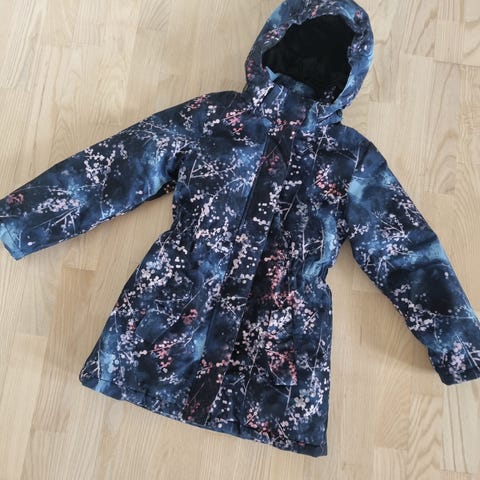 Mørkeblå vinterjakke fra VRS med blomstermotiv og aftagelig hætte. Str. 134 eller 8-9 år.