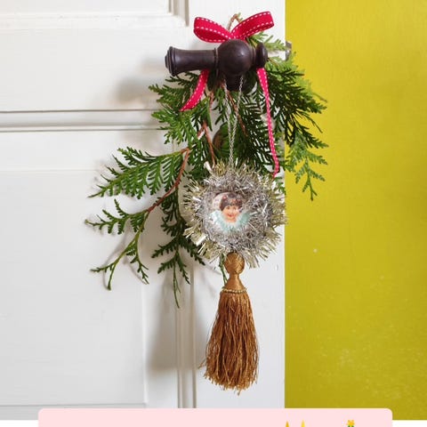 Juleornament med victoriansk glansbillede, gotisk skrift og tinsel på gammel bageform. Vedhæng i form af krystal prisme og smykkekæder. Blondeblomst på bagside. Ophæng i smykkekæde. Hæng det på dit skab, et dørhåndtag, en høj lysestage. Og selvfølgelig på juletræet når det kommer ind. L33 cm inkl ophæng (12 cm). 190 kr.