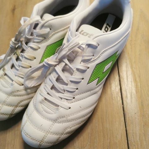 Hvide læder fodboldstøvler (mærket Lotto) med snørrer og knopper. Køges førstehold har skrevet autografer på dem (med sprittusch- så de kan formodentlig renses af med sprit). Købt fra nye og brugt af et barn i en sæson.