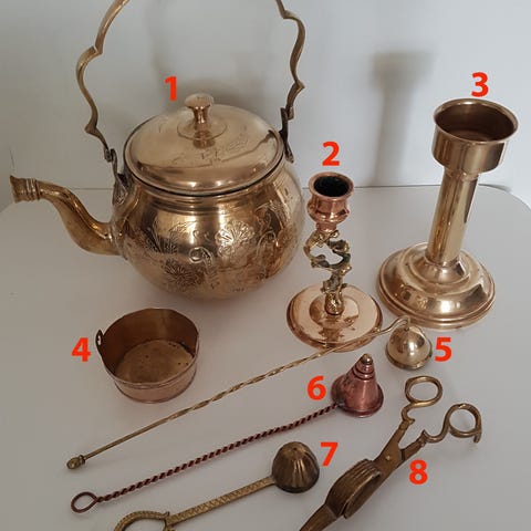 1 stk. Nr. 4 Rigtig sød vaskebalje i messing/kobber, H: 3/med håndtag 4 cm. cm. Ø: 7,2/bund 6 cm . Pris - 40 kr.