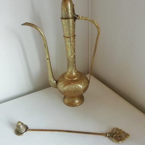 1 stk. Nr. 1. Helt fantastisk smuk kande i messing, over 50 år gammel. Udsmykket med ciseleringer af blomster og bladranker. Den har brugsspor- også kaldet patina. Højde uden låg- 12 cm. Højde med låg- 15,5 cm. Ø: ca. 16 cm. Pris - 200 kr.
