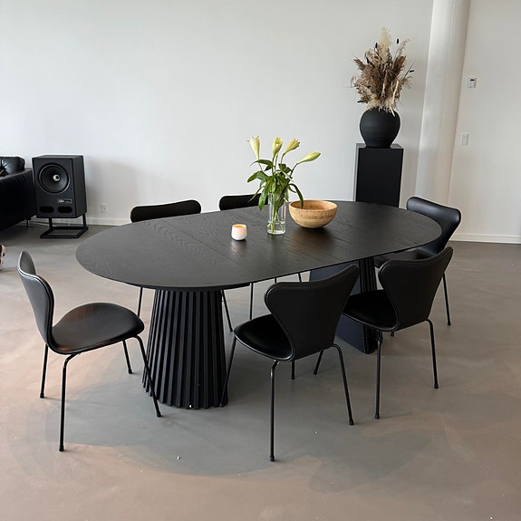 Fuldpolstret i sorte lædersæder med matsorte stel. Siddehøjde 66cm