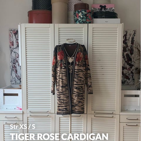 Unik Lind cardigan med tigermotiv på ryggen og lynlåslukning.