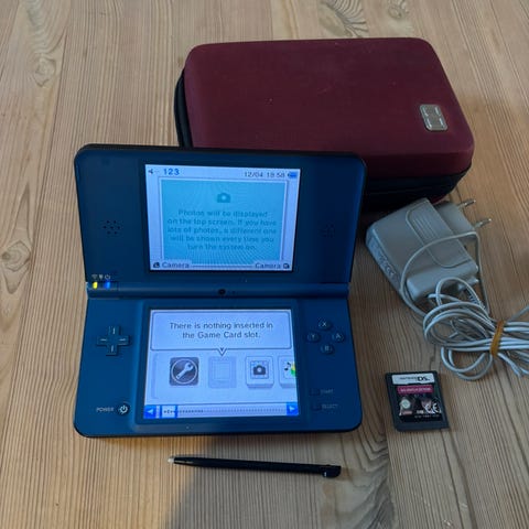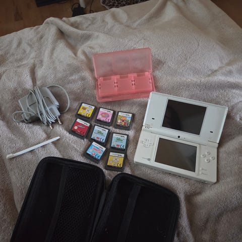Nintendo DSLite,hvid spillekonsol med to skærme, indbygget tastatur og stylus pen. Konsollen leveres med oplader og beskyttende etui til opbevaring og transport. Enheden understøtter Nintendo DS spil.