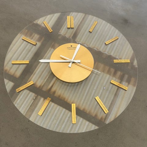 Junghans vægur i teaktræ, formentlig fra 50’erne. Junghans er et tysk urmærke kendt for kvalitetsure. Uret har hjørnedekorationer i messing ligesom visere, tal, pendul og lodder også er i messing. Timetallene er romertal i messing sat på en lys ring, så de er synlige.