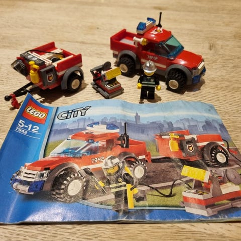 Lego city sæt 7945. Fire Truck. Der mangler 5-10 dele, der er skiftet ud med tilsvarende i andre farver, samt byggevejledningen, men den kan findes online. Til gengæld er der lidt med fra en brandstation. Fra ikke ryger hjem uden dyr. Jeg har også andre Lego sæt til salg. Jeg sender kun ved samlet køb over 200 kr.