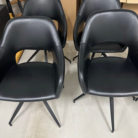 6 flotte og elegante spisebordsstole i sort læderlook som kan dreje. Stolene har armlæn, så du sidder behageligt i lang tid. Fejlkøb - har kun været brugt i 4 måneder. normal pris 1.399 pr. stk. NU PRIS pr. stk. 600 kr. incl armlæn.