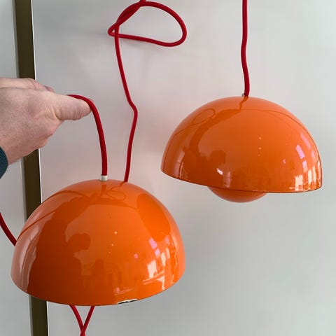 Fedt kunstværk. Maleri af akryl på original Verner panton flowerpot lampe. Den er bemalet og signeret med akryl. Under maleriet gemmer sig en orange emaljeret pendel. Lavet af Brande kunstneren Lund Dickmann.