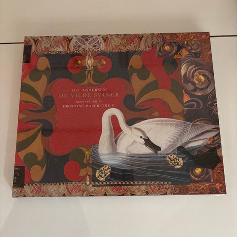 De vilde svaner af H.C. Andersen, uåbnet med cellofan omkring. Illustreret med decoupage af Dronning Margrethe II.
