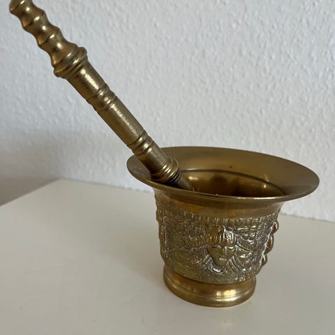 morter, Lækker god tung messing morter 11,5cm høj 12,5cm for oven & cm for neden 1,65kg