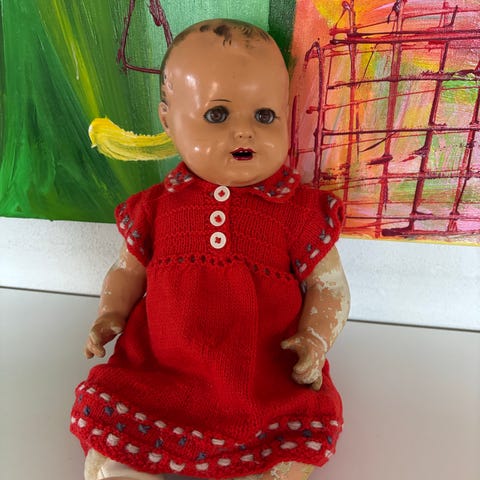25 cm med strikket trøje, sydvest og støvler af sort voksdug, hoved af papmacher. Fra ca. 1935 (=før & nær antik). Selv om alderen har sat sit præg, er det dog ret beskedent