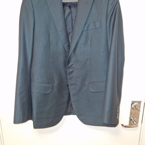 Har en dejlig blå jakkesæt med lyse striber som ikke er nemt at finde i Danmark. På grund af den er håndlavet er en special skrædder, er der ikke størrelse på den, men ville passe til L. Du skal ikke bekymre dig om størrelsen på højden og taljen, da den nemt kan justeres, da der er stof indeni.