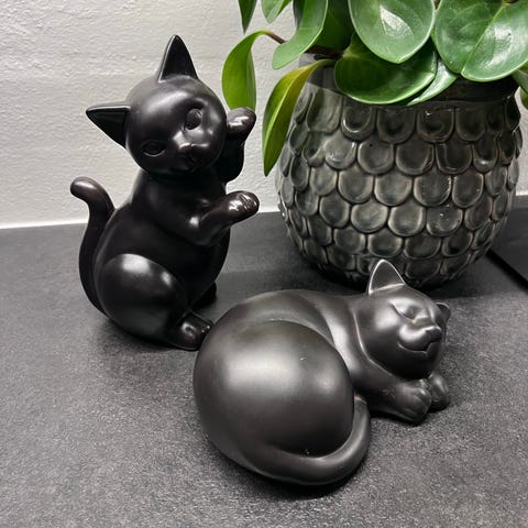 Sort kattefigur med guldfarvede detaljer omkring halsen og på basen. Figuren er designet i en siddende position og har en glat overflade. Velegnet som dekorationsobjekt.