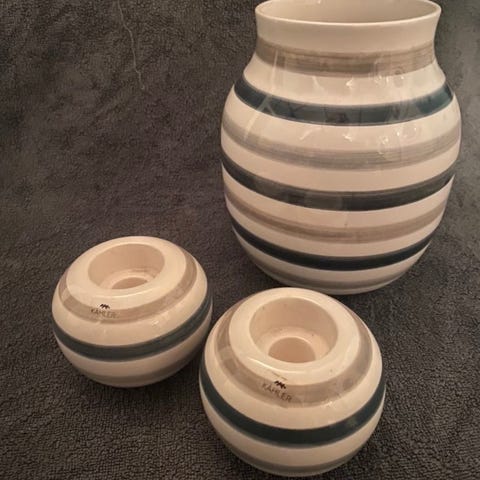 2 fine kahler vaser og en lysestage i sort og hvid stribet
