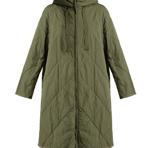 Max Mara Weekend Calenda dunjakke til kvinder i størrelse 42. Rummelig model. Jakken er beige og designet som udendørstøj med en quiltet, diagonalt mønstret overflade. Den har en høj krave og hætte for ekstra beskyttelse mod vejret. Jakken er foret og egnet til koldere temperaturer.
