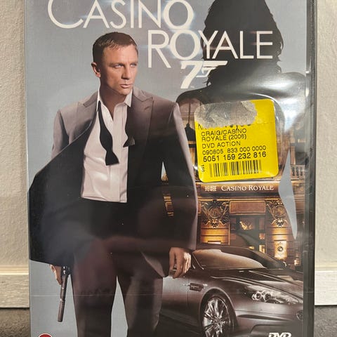 Casino Royale DVD med James Bond som hovedperson. Filmen tilhører actiongenren og indeholder scener fra forskellige steder og situationer. DVD-udgaven er i standardformat og indeholder ekstramateriale som beskrevet på coveret.