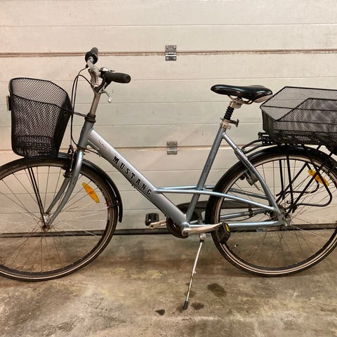 Mustang Alloy Shopper, grå, 28 tommer hjul, 50 cm stel, 7 indvendige gear, affjedring i forgaffel, 3 bremser, dynamolygte, alm brugsspor, køreklar med lås, kr 619,-