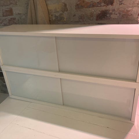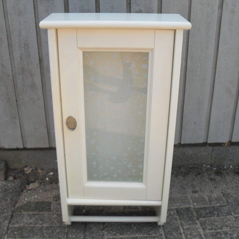 Lille vægskab, med hvide glas skydelåger. På indersiden er der brugsspor og nogle pletter, de er ikke forsøgt skrubbet med men de forsvinder ikke ved alm aftørring. Bag pladen medfølger men de små søm der engang holdt den ind til hylden er der ikke mere. Kan nemt erstattes med nogle nye søm.