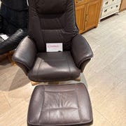 Brun lænestol og skammel med mørkebrun læderpolstring og lys træramme. Lænestolen har en polstret ryg og sæde med syninger, og skamlen matcher med samme materialer. Designet med træarmlæn og ben i lyst træ. Passer til stue- eller læseområde. Magasin i skamlen.