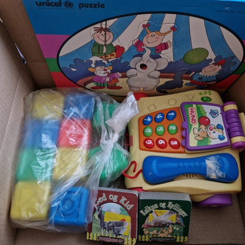 Baby legetøj. Store plus plus i kuffert, 70 stk. (50x30 mm). Ægge puslespil med 12 æg og farverige, geometriske former indeni. Magnetbog med tykke og slidstærke sider og 5 magneter. Alt er BPA- og ftalat-fri og som nyt.