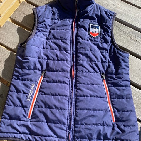Kingsland dame vatteret vest i navy blå farve. Lavet i let materiale med mønster. Vesten har glidelås foran med Kingsland-logo og elastisk bånd i livet og i halsen med Kingsland tekst.