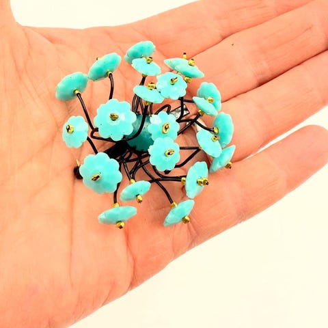 Små chiliformede brocher i forskellige farver. Der er hvid, turkis, gul, pink og rød. De er ubrugte. Længde 4,2 cm.