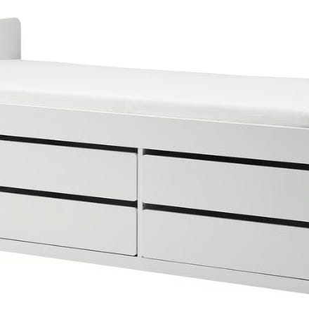 IKEA seng i hvid med tilhørende opbevaringsskuffe på hjul.