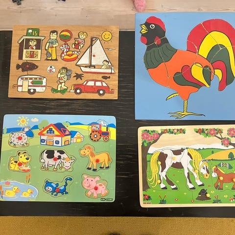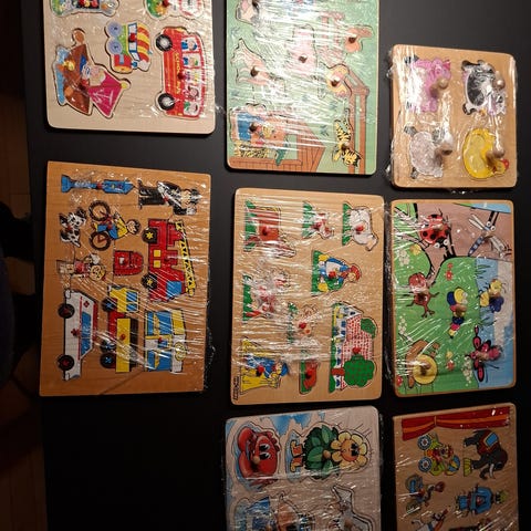 Træ puslespil består af 8 forskellige puslespil i træ med farverige motiver, herunder dyr, tøj, køretøjer og figurer. Hvert puslespil har forskellige former og størrelser, designet til børn. Materialet er træ, og puslespillene er velegnede til børns motoriske udvikling og læring af former og genstande.