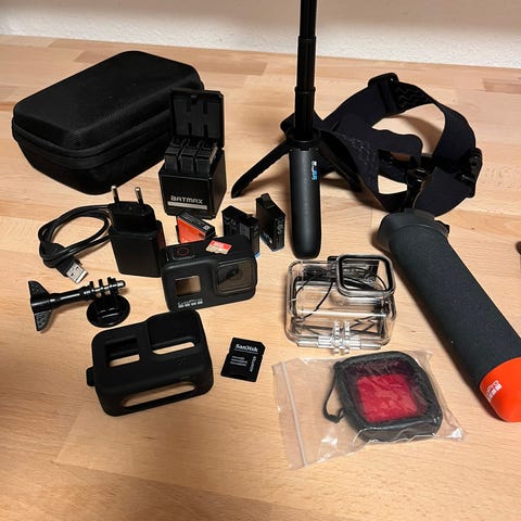 • GoPro HERO 7 Black (har en lille revne ved power-knappen og er derfor ikke længere vandtæt, men fungerer)