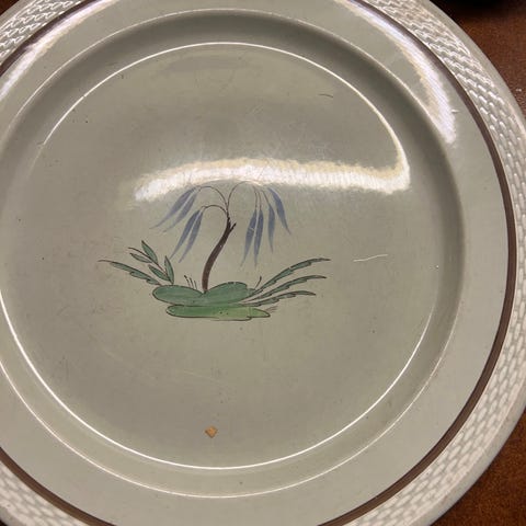 Fajance, Tallerken, Aluminia, 2 gamle Aluminia frugttallerkner. På bagsiden står med grønt Copenhagen Denmark og man kan svagt ane et aluminia presset ind i glasuren. Den ene har et lille hak i kanten og begge har 1-2 knappenåls hak i kanten - kan mærkes med en negl. Felter billeder kan sendes. Samlet pris kr 115