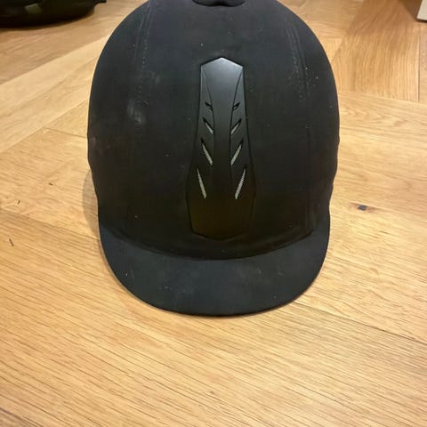 Ridehjelm i mat sort farve med skygge foran. Hjelmen har en justerbar rem under hagen og en dekorativ metalstribe på toppen. Designet til at beskytte hovedet ved ridning.