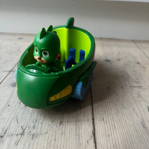 Pyjamasheltene PJ Masks legetøjsbåd i rød farve med en lille figur i matchende farve. Båden har plads til en figur og detaljer som sæde og hjul under båden. Legetøjet er designet til børn og kan bruges til rolleleg og fantasifuld leg.