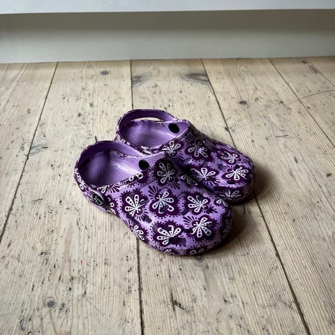 Crocs Børn Sko i størrelse 34, farve lilla. Skoene er lavet af letvægtsmateriale med ventilationshuller for åndbarhed. Designet til piger med justerbar hælrem for bedre pasform og komfort.