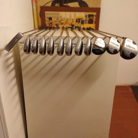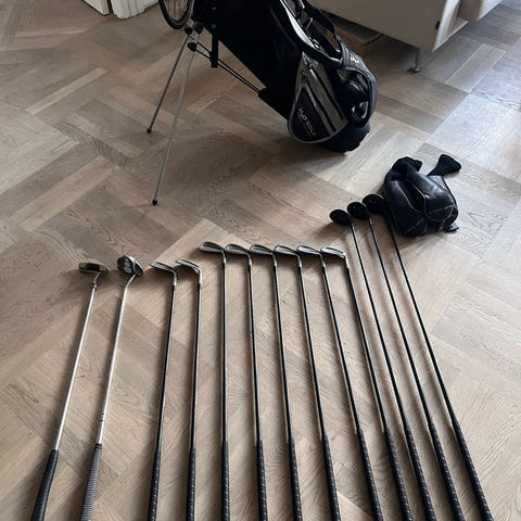 Wilson Staff golfkøller sæt inklusive flere køller af forskellig type og en bære-/opbevaringstaske i sort og grå farve. Køllerne har stål skaft og er designet til alsidig brug på golfbanen. Tasken har flere rum til opbevaring og bærehåndtag for nem transport.