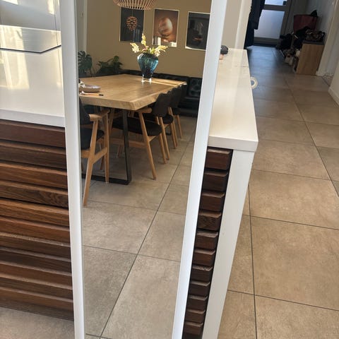 Et super flot hvidt Porcelænsspejl. Et spejl med porcelæns ramme. I god stand!