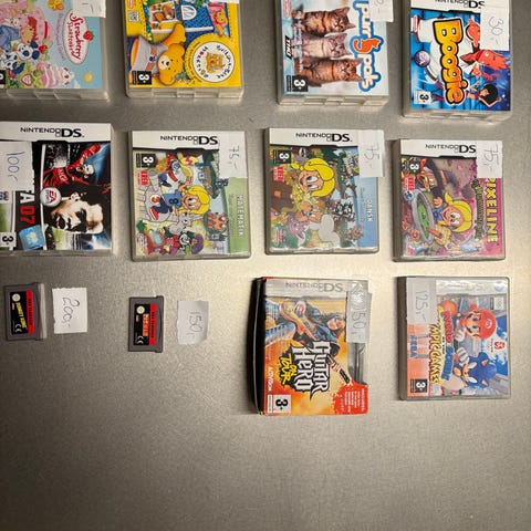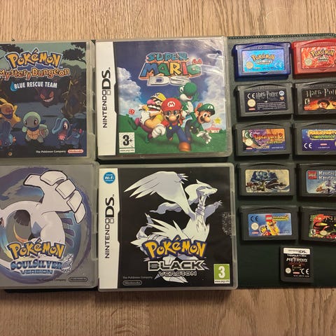 2 stk. Nintendo DS (sølv og sort) med originale opladere, Nintendo Game Boy Color (limegrøn), 2 originale Nintendo bæltetasker, GBA Movie Player i æske. Spil: Mario Kart DS, Super Mario Bros 3, GTA Chinatown Wars, GTA2, Probotector, Sonic, Sega Rally, Star Wars Episode III, samt diverse Game Boy- og DS-kassetter.