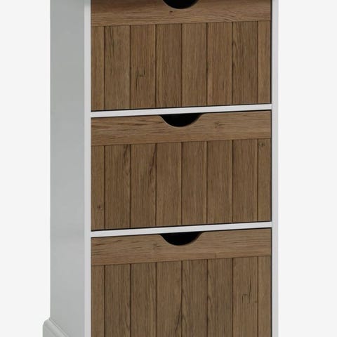 Jysk kommode fremstillet i træ med en naturlig træfarve. Kommoden har to skuffer i midten og et skab med hylde på hver side, hvilket giver god opbevaringsplads. Designet er enkelt og funktionelt, egnet til opbevaring i forskellige rum som stue eller soveværelse.
