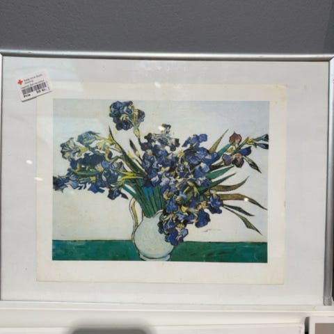 Billedet viser et indrammet vægkunst med blomstermotiv. Det er broderet på en mørk baggrund. Rammen er i en lys farve.,Afhentes i:,Røde Kors Kolding (621),Bemærk at mail, chat og beskeder ikke besvares, og varen skal købes på knappen "Gå til varen"