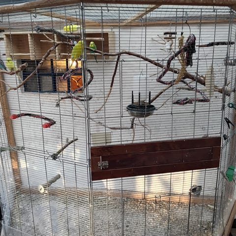 Metalkonstruktion udendørs voliere med dør. Konstruktionen er lavet af metal med netindhegning og egnet til fugle eller smådyr. Volieren har en rektangulær form og er designet til udendørs brug i haven.