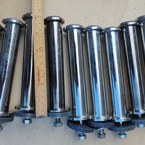 Har fem stk. i alt af disse - to i lyseblå, en i grøn og to i lyselilla. Alle med messinghåndtag.