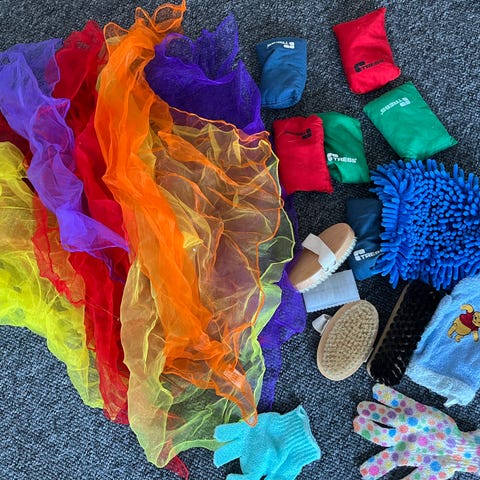 Indeholder rasleæg, ciffon tørklæde, sansering, 3 stk sansebolde og mini faldskærm