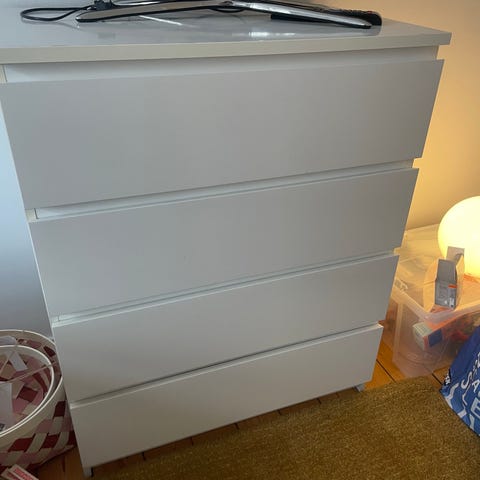IKEA Malmkommode med fire skuffer i hvid finish. egnet til opbevaring i forskellige rum. Afhentes gerne i dag derfor lav pris