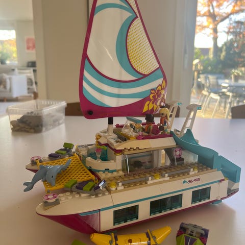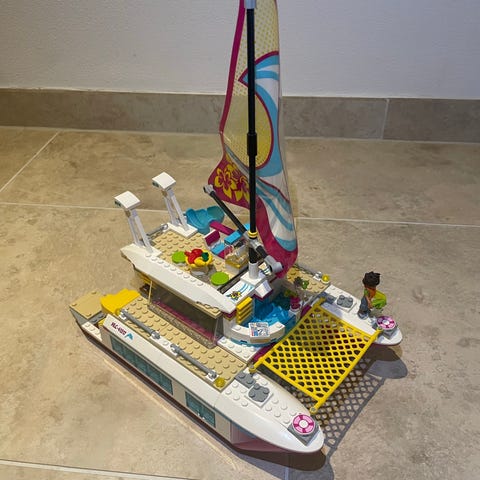 LEGO Friends Katamaran legetøj i blå og hvid farve. Modellen indeholder detaljer som sejl med dekoration, liggeplads og trapper. Egnet til børn og designet til leg og samling.