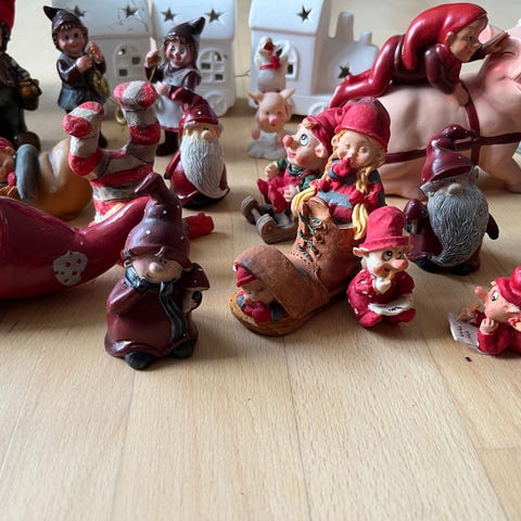 Sæt af julefigurer til dekoration i forbindelse med julen. Indeholder forskellige nisser og julemandsskikkelser i forskellige størrelser og materialer. Velegnet til indendørs brug som en del af julepynten.